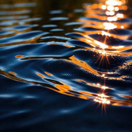 Experience the serene beauty of glimmering water surfaces at sunset, where vibrant orange and gold reflections create a tranquil and peaceful atmosphere.