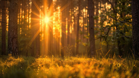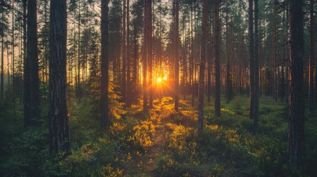 Golden sunlight streams through the tall trees of a summer forest, illuminating the underbrush and creating a peaceful ambiance as nature comes alive with warmth and serenity.