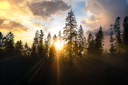 Aerial view of dark green pine trees in spruce forest with sunrise rays shining through branches in foggy autumn mountains.