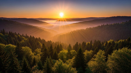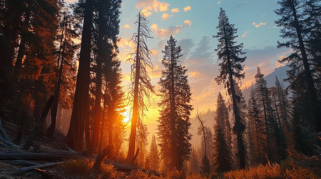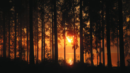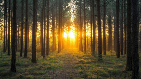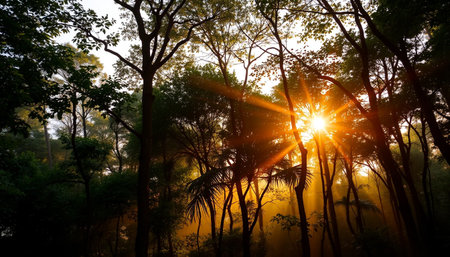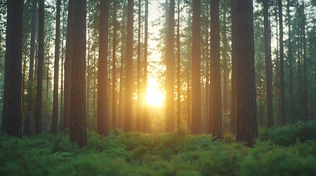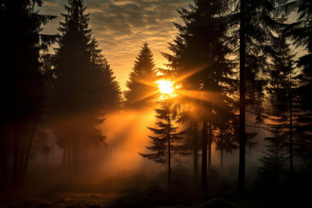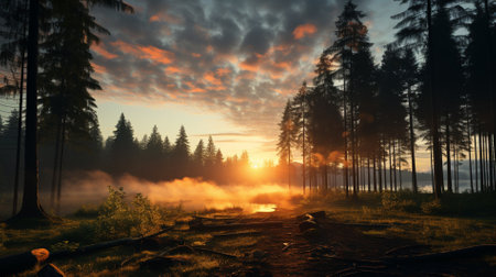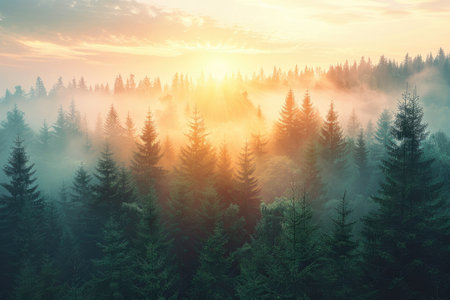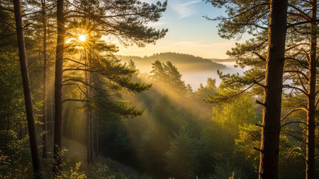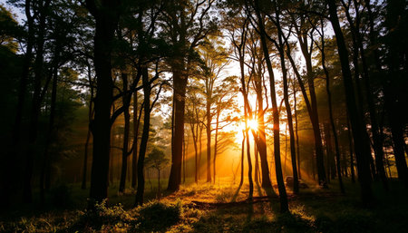 Breathtaking sunrise over misty forest with majestic tall trees and serene atmosphere