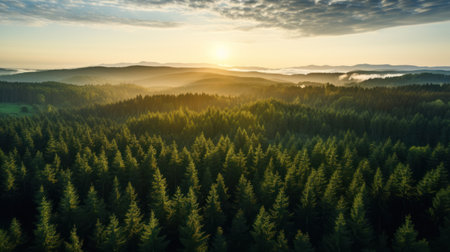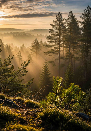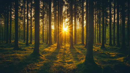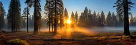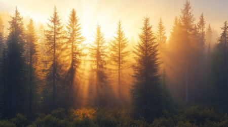 Warm sunlight filtering through a misty coniferous forest at sunrise creates a breathtaking panorama, showcasing natures beauty and evoking a sense of tranquility in the wilderness