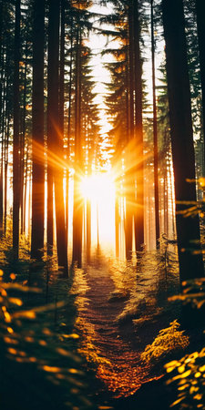 A stunning scene of sunlight bursting through trees in a tranquil forest. The golden rays create a magical atmosphere, illuminating the serene path ahead.