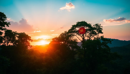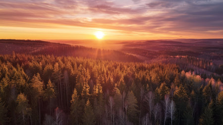 A breathtaking high-resolution image captures the golden hour as the sun rises behind a majestic forest, painting the sky with vibrant hues This photorealistic masterpiece evokes feelings of new beginnings and inspires with its stunning detail and natural beauty, perfect for projects seeking a touch of awe-inspiring nature AI Generative