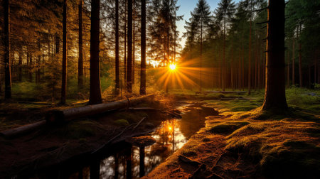 A powerful composition ideal for nature magazines, environmental campaigns, or as a stunning desktop wallpaper | This evocative image Beckons viewers into a serene forest scene illuminated by the warm, golden rays of a setting sun. The light filters through the tall, straight trunks, casting long, dramatic shadows that stretch across the forest floor, inviting contemplation of the tranquil and timeless beauty of the natural world. A small, meandering stream reflects the sunlight, creating a pathway of dappled light that leads the eye deeper into the forest, suggesting exploration and discovery. The vivid moss and rich undergrowth are given a mystical quality by this ethereal light, emphasizing the raw purity of the environment. Sharp contrasts between light and dark areas give the scene depth and dimension, while a starburst effect around the sun adds a dynamic energy to the otherwise still and peaceful setting. The fallen, decaying logs remind us of the life cycle within the forest, and the resilience and constant renewal of nature | This photograph is perfect for educational purposes to demonstrate the beauty of natural light in a woodland setting, for environmental organizations promoting the conservation of forests, or as a peaceful and inspiring image for meditation and relaxation spaces. It can also be an attractive piece for those in the tourism industry to showcase the allure of adventure in natural surroundings | a rich and detailed image of a sunset in a forest, capturing the contrast of light and shadow, and the peacefulness of the woods in golden hour lighting, with ample room for overlays