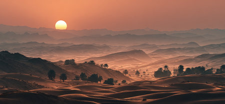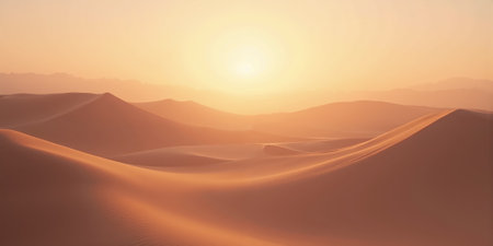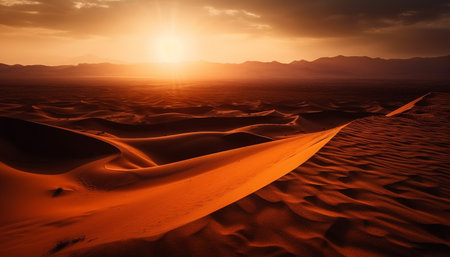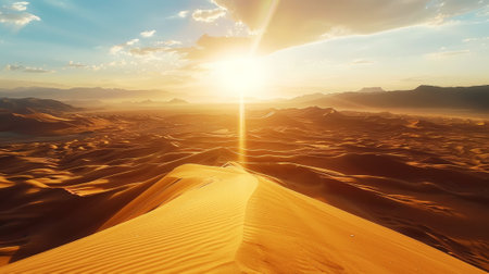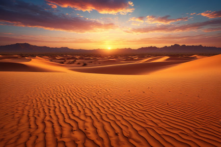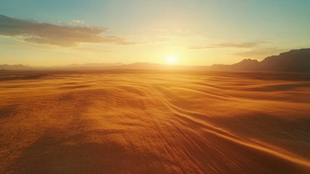 A vast desert expanse is bathed in the warm glow of a setting sun. The composition features rolling sand dunes and distant mountain ranges. The scene is dominated by golden and orange hues, with a dramatic overhead lighting. Suitable for use in a variety of commercial and editorial contexts.