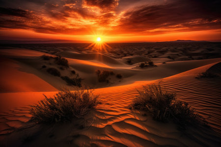 Sand dunes at sunset, with the sun setting behind them, against a fiery sky, with a sense of natural beauty and awe. Generative AI