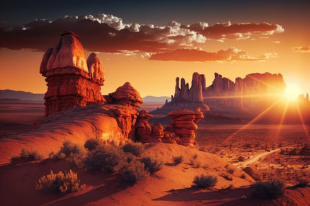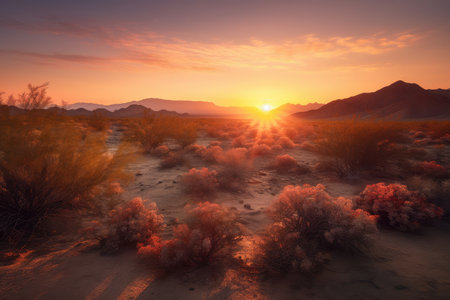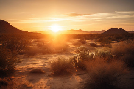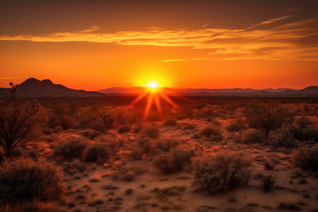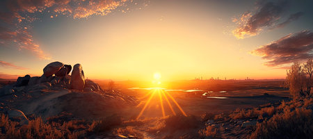 sunset over desert landscape, with the sun casting a warm glow, created with generative ai