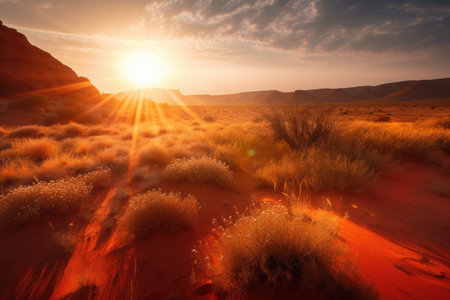sunrise over red sand dunes, with the suns rays bringing color to the landscape, created with generative ai