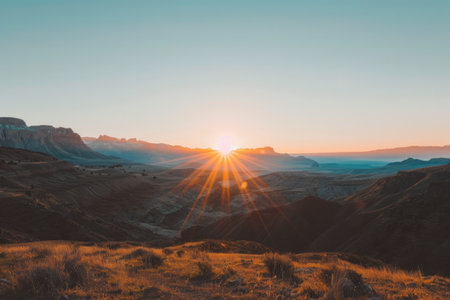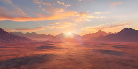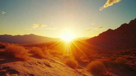 The brilliant sun casts a warm glow across the expansive desert terrain illuminating the distant mountains and creating a serene atmosphere