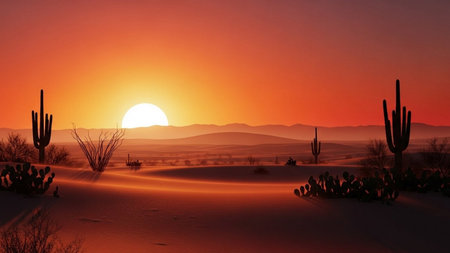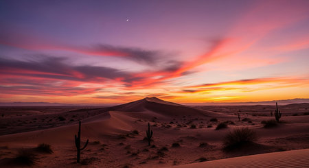 Sunset in the desert with cacti and sand dunes