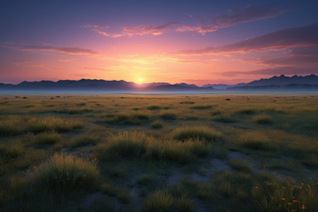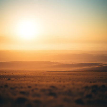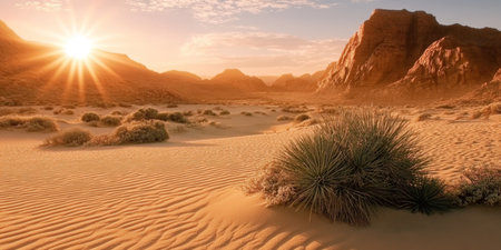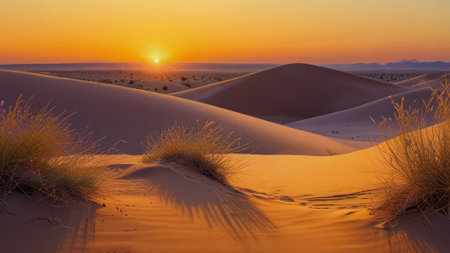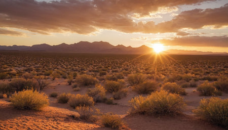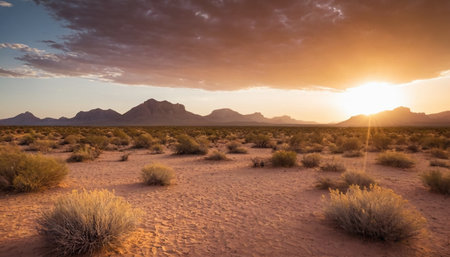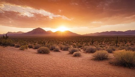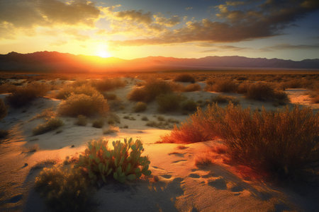Sunset over the desert: A breathtaking display of golden hues transforms the landscape, evoking a sense of serenity and captivating beauty