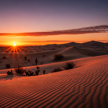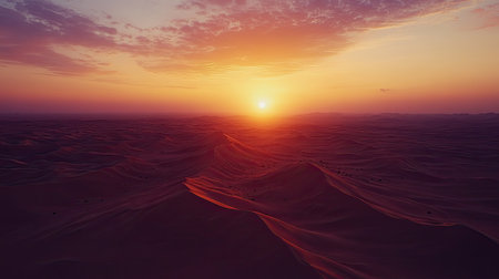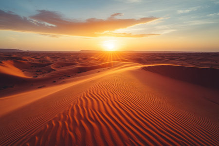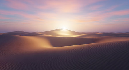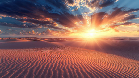 A breathtaking sunrise unfolds over a vast desert landscape, casting warm hues across the sky. The golden rays illuminate undulating sand dunes, creating a serene and stunning atmosphere.