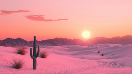 A stunning desert landscape showcases a bright sunset with hues of pink and orange. A solitary cactus stands tall near the pink sand dunes, creating a serene atmosphere.
