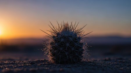A close-up captures a spiky desert cactus silhouetted against a gradient sunset. The image displays warm orange and cool blue hues, and a shallow depth of field. This photographic style could be suitable for environmental, travel, or nature-themed projects.
