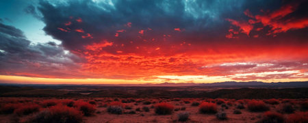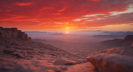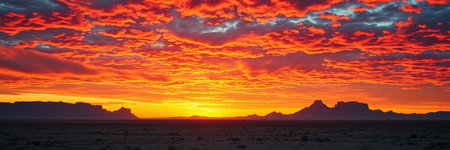 AI Generated. A dramatic shot of a sunset over a rocky desert landscape where the sky ignites in vibrant hues of red and orange