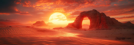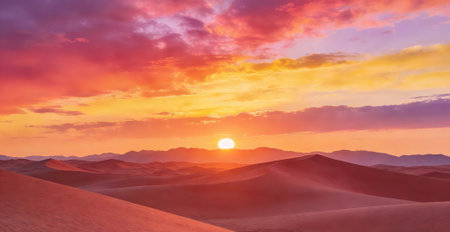 A breathtaking desert sunset illuminates rolling sand dunes, creating a landscape of fiery colors and adventurous beauty.