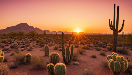 Vibrant sunset illuminates the desert terrain, highlighting cacti and distant mountains under a colorful sky.