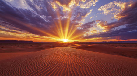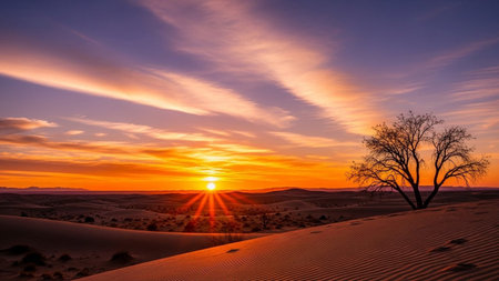 A dramatic desert sunset vibrant orange sun rays piercing colorful clouds over rolling sand dunes and a solitary...