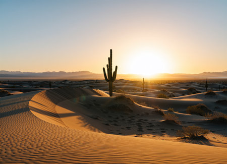 Scenic desert view featuring a tall cactus, with rolling sand dunes illuminated by a stunning sunset, creating a tranquil atmosphere AI Generated Image.