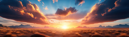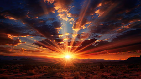 Majestic golden sky at sunset with rays of light breaking through the clouds, illuminating a vast desert landscape