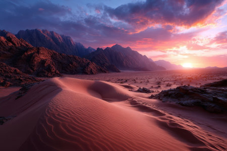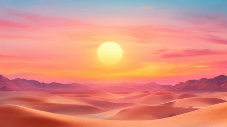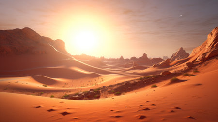 A sunset over a desert landscape with sand dunes created with Generative AI