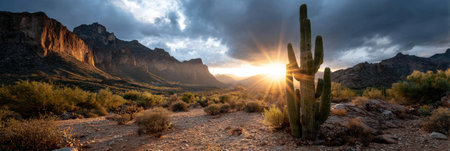A desert landscape with a cactus in the foreground and a mountain in the background. The sun is setting, casting a warm glow over the scene