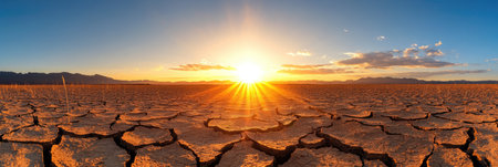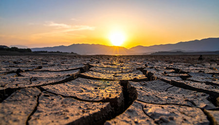 A stunning sunset illuminates the cracked earth of a desert, highlighting the intricate patterns formed by dryness.