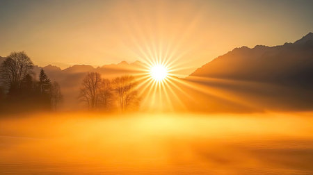 Experience the breathtaking beauty of a sunrise illuminating a misty landscape, with vibrant sun rays piercing through a serene morning sky.