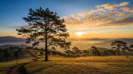Breathtaking view of a sunrise illuminating rolling hills, featuring misty landscapes and greenery, evoking tranquility and the beauty of nature's pristine mornings.