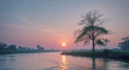 AI Generated. Tranquil River Landscape at Dusk with Orange Sun and Solitary Tree
