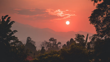 Natural showing dramatic sunset over a misty landscape with vibrant orange and purple sky and silhouetted trees...