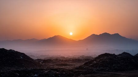 This stunning sunset showcases a warm orange glow over rolling hills, creating a tranquil atmosphere perfect for nature lovers and landscape photography enthusiasts.