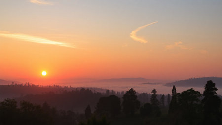 Above showing dramatic sunset over a misty landscape with layers of orange and purple hues in the sky and soft fog covering the rolling hills below creating a view...