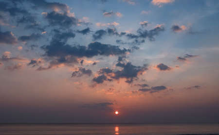 Beautiful sunset over sea in red and yellow colors, cloudy sky.