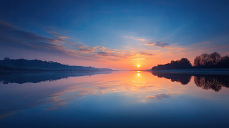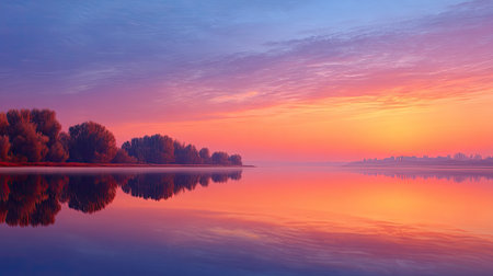Serene Sunrise Over Tranquil Waters A Stunning Reflection of Trees and Sky in Morning Light
