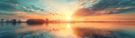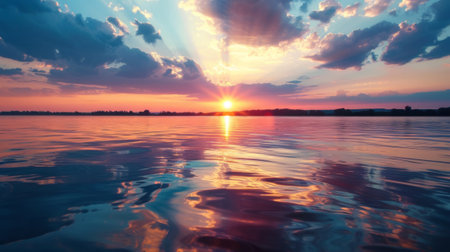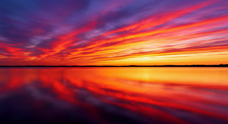 A breathtaking view of a sunset over a calm body of water, with stunning reflections and a tranquil sky filled with colorful hues, perfect for nature lovers.