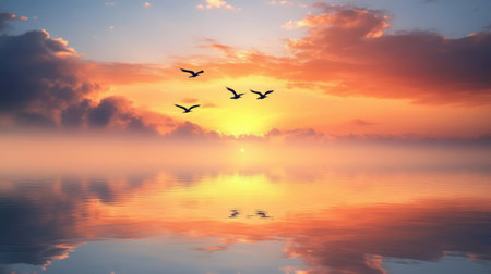 A tranquil sunset scene featuring a flock of birds gracefully flying across colorful skies. The reflections on the water enhance the serene atmosphere. Perfect for nature lovers.