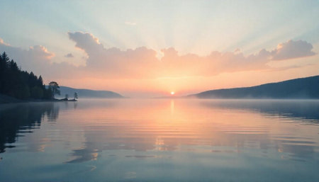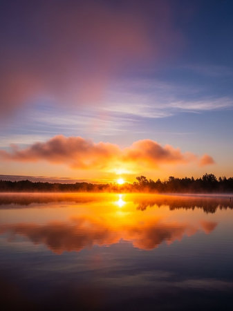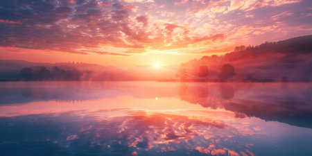 Breathtaking Sunrise Illuminates the Peaceful Lake, Casting Beautiful Reflections on Tranquil Waters
