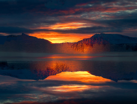 A beautiful, artistic double exposure of sunrise in the arctic Norway above fjords with mountains in the distance. Arctic nature in Scandinavia during winter season.