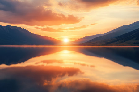 A photorealistic image of the mountains reflecting in an expansive lake at sunset, with warm hues and soft lighting, captured in the style of Sony Alpha A7 III camera with Zeiss Batis lens. The sky is painted with orange clouds, creating a serene atmosphere, while distant hills add depth to the scene. High-resolution photography style, emphasizing tranquility and natural beauty. --ar 3:2 --v 6.1 Job ID: 1c022469-c0de-4106-91c1-60248554f5c4