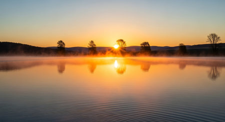 As the sun rises, the lake glows with warm hues, enveloped in mist. Trees border the calm waters, enhancing the serene atmosphere of early morning.