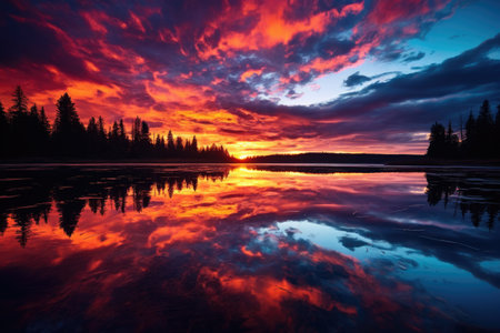 Smooth lake surface perfectly reflects vivid fiery colors of a spectacular blazing sunset sky creating mirror image