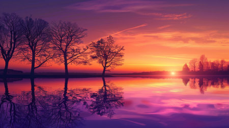A breathtaking sunset over a calm lake creates a stunning reflection of vibrant colors. Silhouetted trees frame the tranquil landscape, evoking a sense of peace.
