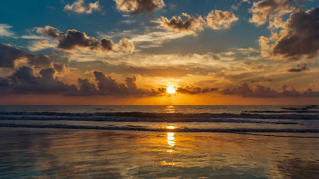 A stunning view of the sunrise over the ocean, with calm waves and a golden sky. The reflection of the sky in the water creates a mesmerizing image.