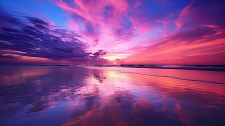 A breathtaking sunset paints the sky with vibrant hues while reflecting on tranquil ocean waters.