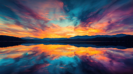 A stunning sunset casts vibrant colors over a calm lake, creating a mirror-like reflection of the sky and silhouetted trees, embodying peace.