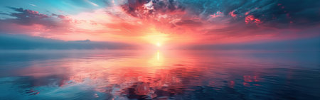 Vibrant Orange And Pink Sky Reflecting On Calm Lake, Creating A Mirrorlike Effect. Panoramic banner