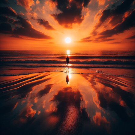 A solitary figure stands on a reflective beach, gazing at the vibrant, dramatic sunset sky with colorful clouds.