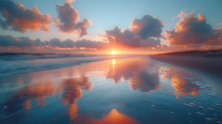 Vibrant sunrise over a peaceful beach, golden sunbeams piercing through clouds, casting reflections on smooth wet sand and still water, evoking calmness and natural beauty.