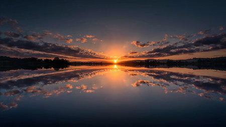 Peaceful sunset reflection on calm lake surrounded by nature